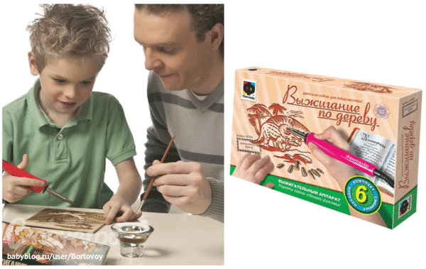 3. Выжигание. Помимо того, что выжигание очень доступное, интересное и творческое занятие, оно очень полезно для развития в ребенке внимательности. аккуратности, усидчивости. С по деревянной поверхности - доске, фанере, ложке, рамке для фотографий, шкатулке. Результат очень зависит как от вида прибора, так и от древесины, на которой выполняется работа. Вначале на заготовку наносят рисунок карандашом, затем приступают к выжиганию. Готовую работу можно покрыть бесцветным лаком. С помощью пирографии можно сделать как простой узор, так и сложнейшую картину, портрет или неповторимый пейзаж.