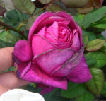 Крупные, пурпурно-фиолетовые цветки источают полный, насыщенный аромат благородных роз. Куст округлой формы с короткими, компактными цветоносами. Листва средне-зеленая с синеватым налетом, кожистая.