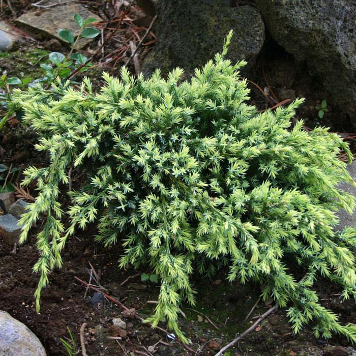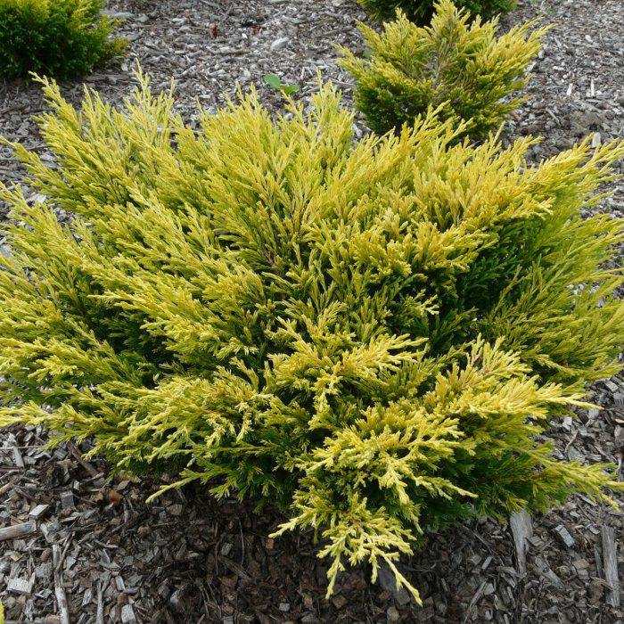 Компактный можжевельник с сине-зеленой хвоей. Молодые приросты имеют золотисто-желтую окраску. Нарастает медленно (до 10 см в год). Толерантен к любым видам почв. В/ш 50*150 см в возрасте 10 лет.