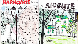Надеюсь, что "физиков" порадовала, теперь попробую порадовать "лириков". Издательство выпускает много разнообразных творческих блокнотов. Покупаем мы их тоже много: что-то оставляем себе, что-то дарим. Из купленного недавно очень понравилось издание, которое... ...уже не совсем книга, но ещё не совсем блокнот.  Мне понравилось то, что в отличии от многих подобных изданий, в которых на каждой странице идёт задание, а затем пустая страница, в блокноте Хендрикса изначально много рисунка и текста. Во-первых, это избавляет от страха чистого листа. И места свободного меньше, и исходные рисунки выполнены легко, небрежно, что ты понимаешь: ага, он смог здесь нарисовать что-то, значит, сможешь и ты. На некоторых страницах со временем уже и не понимаешь, что было там изначально, а что дорисовал и дописал ты сам. А во-вторых, тексты в скетчбуке — это не только задания для рисования, но и полезные советы. Я взяла этот скетчбук в отпуск, в поездку на море. Рисовала в поезде, рисовала на пляже. Рисовала с натуры и с фотографий из своей ленты. Покажу здесь пару фрагментов из моего блокнота. Не судите строго - я только с книгами этого издательства избавилась от комплекса на тему "я художник от слова "худо", и теперь просто рисую и получаю от этого удовольствие. А потому любимая цитата из книги: "В изостудии ценится точность. В рисунке от души ценится удовольствие".
