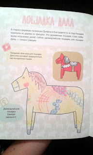 Во-вторых, оформлением. Рисунки незатейливы — словно рисовал ребёнок, однако все образы — и викинги, и известные здания Стокгольма, и лошадки Дала — прекрасно узнаваемы. Все рисунки чёрно-белые, этот факт вкупе с простотой просто мотивирует взять цветные карандаши и раскрасить всё. И это уже будет в-третьих — интерактивность книги. На каждом развороте книги приведены задания: дописать, дорисовать, раскрасить, вырезать, склеить. И всё эти задания — не сами по себе, они органично вписываются в знакомство с историей и культурой Швеции. Задания очень простые — не случайно издательство рекомендует книгу детям от 5 лет.
