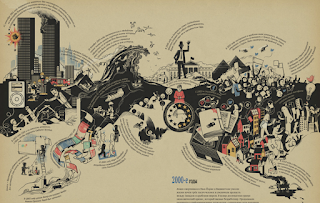 3. События прошлого представлены более обобщённо, но чем ближе к нашему времени, тем сильнее конкретизация. Из 36 разворотов книги десять посвящены периоду от начала ХХ века и до наших дней. Даже этот, для кого-то малозначительный момент, может быть использован для иллюстрации закона ускорения общественного развития.