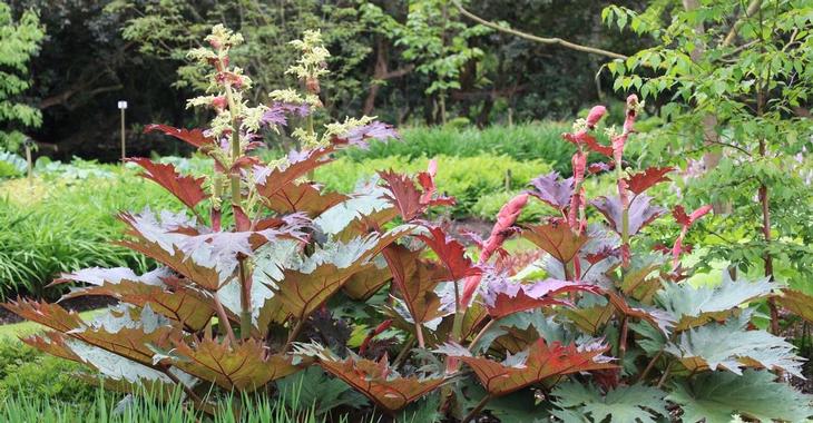 "...Габариты этой экзотической красавицы требуют простора! Весной, когда почва успеет хорошо прогреться, но ещё сохраняет достаточный запас влаги, появляются высокие цветоносы, на вершине которых раскрываются довольно крупные, 10—12 см в диаметре, зонтиковидные соцветия небольших нежно-розовых цветков светло-сиреневых или лиловых оттенков. В начале лета на толстых сочных черешках длиной до 90 см раскрываются большие, около 50 см в диаметре, ярко-зелёные, с чётко выраженным жилкованием и широкопильчатым краем, листья.