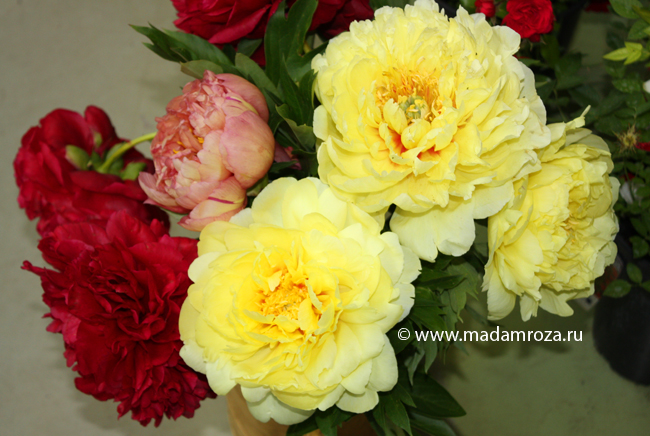 Очень празднично смотрятся желтые пионы в сочетании с красным