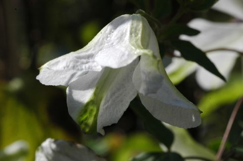 "Viticella. Белые цветы с зелеными кончиками лепестков и бледно-зеленая полоса на реверсе. Количество зеленого цвета зависит от количества солнечного света цветы get - много солнца будет в результате меньше-зеленую окраску. Очень глубокие фиолетовые пыльники. Это самый необычный сорт был поднят Витч и сын c.1900."