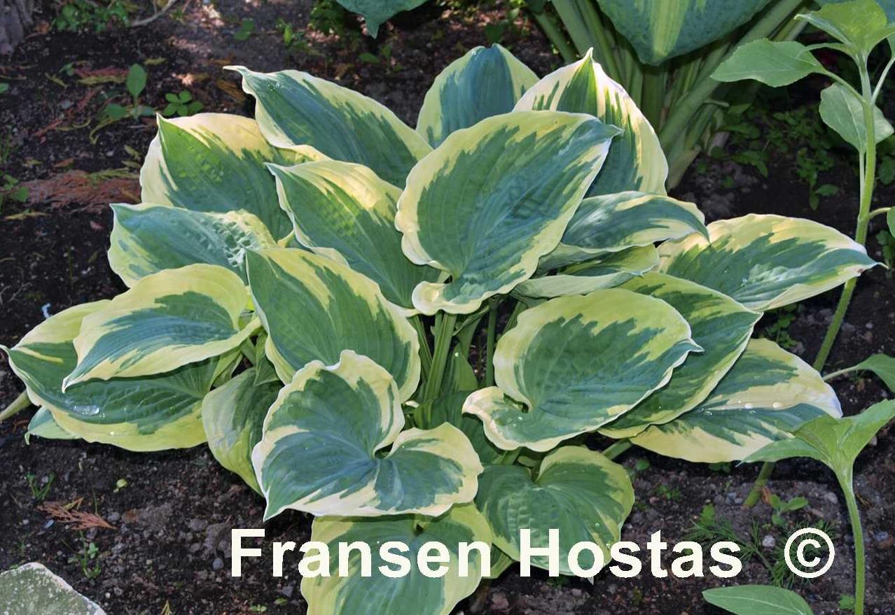 Знаменитый старый и очень красивый сорт, пользующийся неизменной популярностью. Сердцевидной формы лист сливочно-кремовый, окаймлённый сразу двумя цветами: светло-зелёным по контуру центральной части, а по краю листа - сине-зелёным. Цветы практически белые на кремовом цветоносе. Лучшее место посадки - полутень, тень. 50-60 см