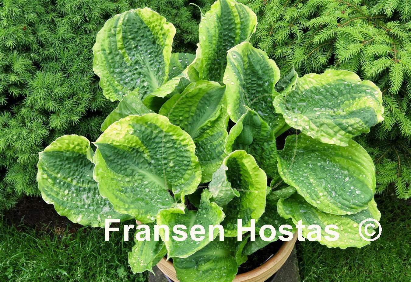 Сильно гофрированные зеленые листья с гофрированным желтым краем, который превращается в кремово-белый по ходу сезона. Это среднего размера хоста, которая имеет бледно-сиреневые цветки. Тень/полутень. Высота от 50 до 55 см. Темп роста от среднего до медленного.
