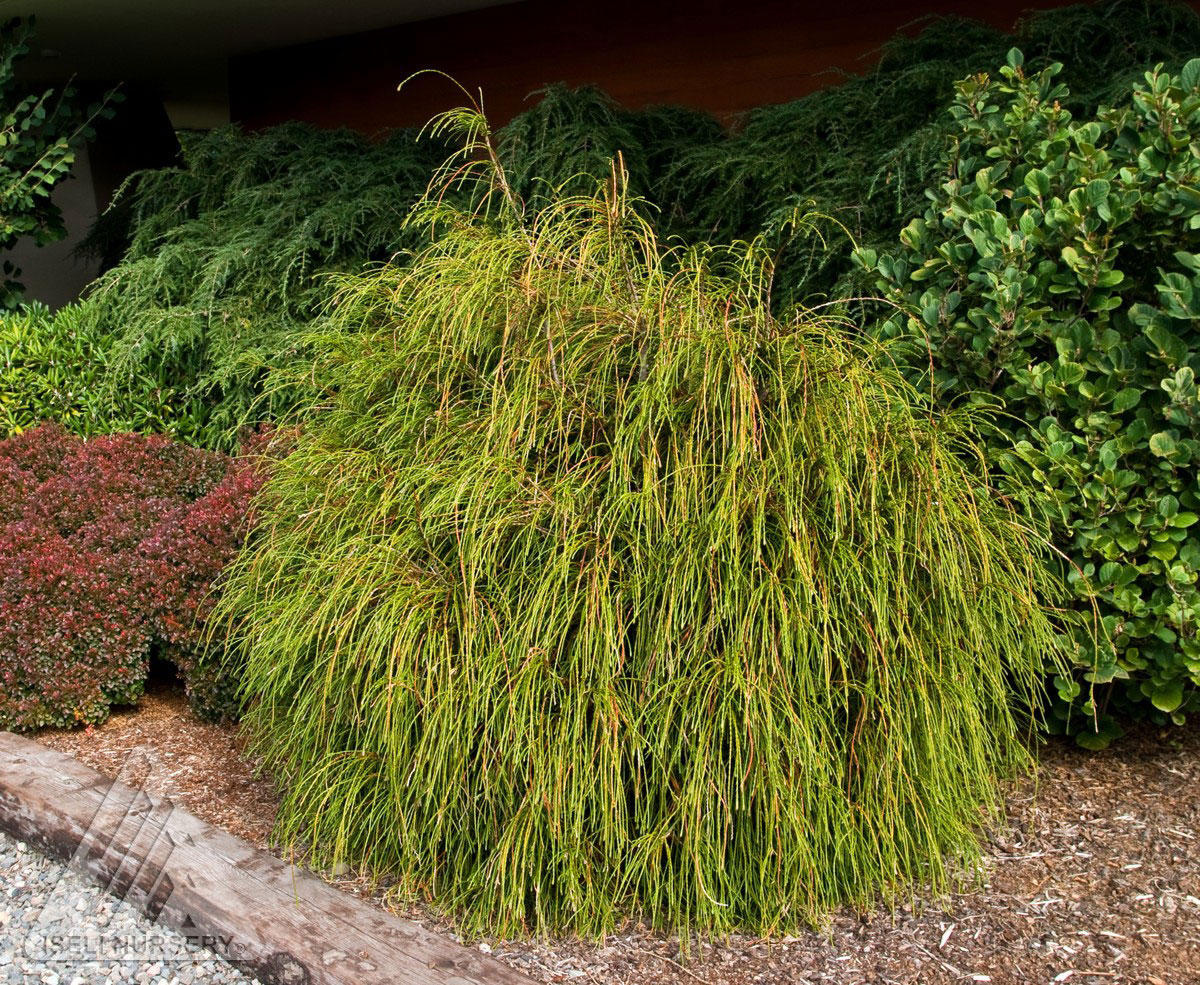 медленнорастущий карликовый кустик с тонкими, гибкими побегами, свисающими вниз. Концы ветвей – длинные нитевидные малооблиственные побеги. Хвоинки зеленого насыщенного цвета. Любит хорошие плодородные почвы, регулярный полив и опрыскивание. Отлично переносит полутень и яркое солнце, годовой прирост всего от 5 до 8 см в высоту. Взрослое растение в форме плотного шарика при благоприятных условиях развития достигает 1 м по ширине кроны и в высоту. Темно-зеленая хвоя отлично контрастирует с коричневой, а иной раз бурой корой.