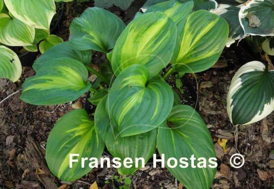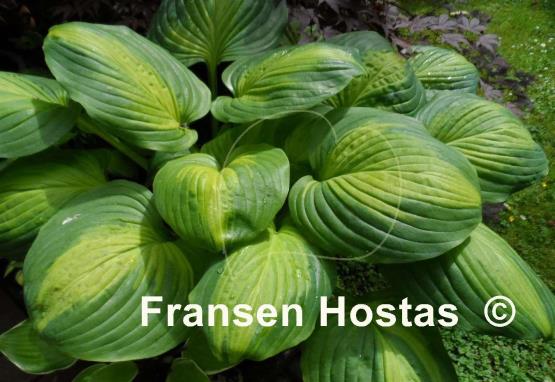 Листья морщинистые с широкой сине-зелёной каймой  и центром цвета шартрез в начале сезона. Центр листа постепенно приобретает  золотисто-желтую окраску. Формирует крупный эффектный куст, устойчивый к слизням. Цветы почти белые. Спорт от сорта DickWard. Размер 50-55 см. Место посадки тень/полутень.