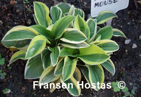 Hosta Mighty Mouse   Очень толстые круглые сине-зеленые листья с нерегулярным кремово-желтым краем, спорт «Голубые мышки». Высота составляет от 15 до 25 см, рост - средний .