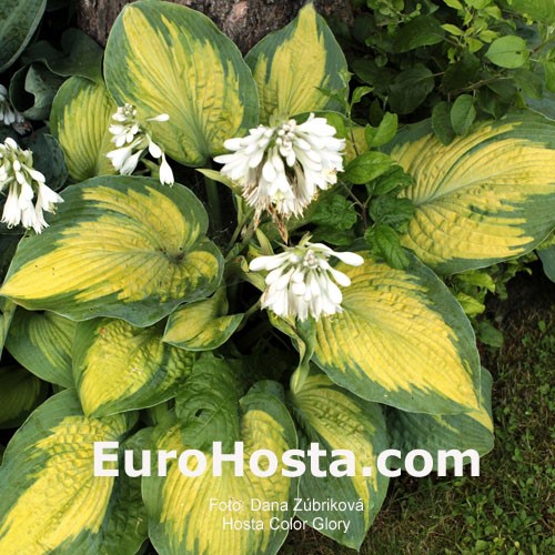 Высота растения: 50-60 см. Ширина растения: 80-90 см. "Хоста Калор Глори Hosta Color Glory лиственно- декоративное растение. Как ещё может выглядеть хоста, названная именем «Цвет Славы»? Конечно великолепно! Куст как большой плотный купол, листья почти округлые, плотные, чуть чашевидные, весной салатово-жёлтые, летом жёлтые с неравномерной широкой сине-зелёной каймой, текстура их жатая. Hosta Color Glory хорошо растет не только в полутени, но и на солнечных местах. Очень эффектна! Цветы белые. Устойчива к повреждению улитками и слизнями.